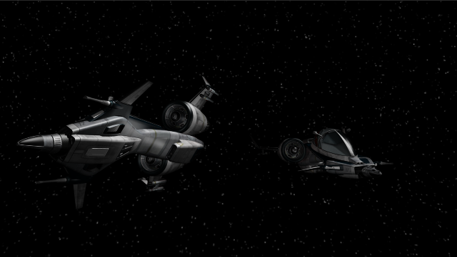 The following screenshots are a breakdown of some of the layers in the ship scene. I purchased the Thunderbike model from Daz3D. I did the 3D animation in Blender, attached some lights, and exported the camera and object data out to After Effects. While Blender was rendering, I went over to After Effects to set up my scene, ie background stars, parented lights to object data from Blender.